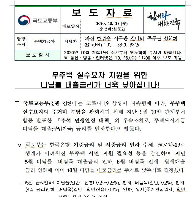 국토부, 디딤돌 대출 금리인하 5월에이어 10월에 연속 내려 최저 1.2%에 주택담보대출 받을 수 있어... 그 외에도 두 대출의 자격요건과 주의점은 매일경제 부동산 유튜브채널 매부리TV에서 상세 설명합니다.